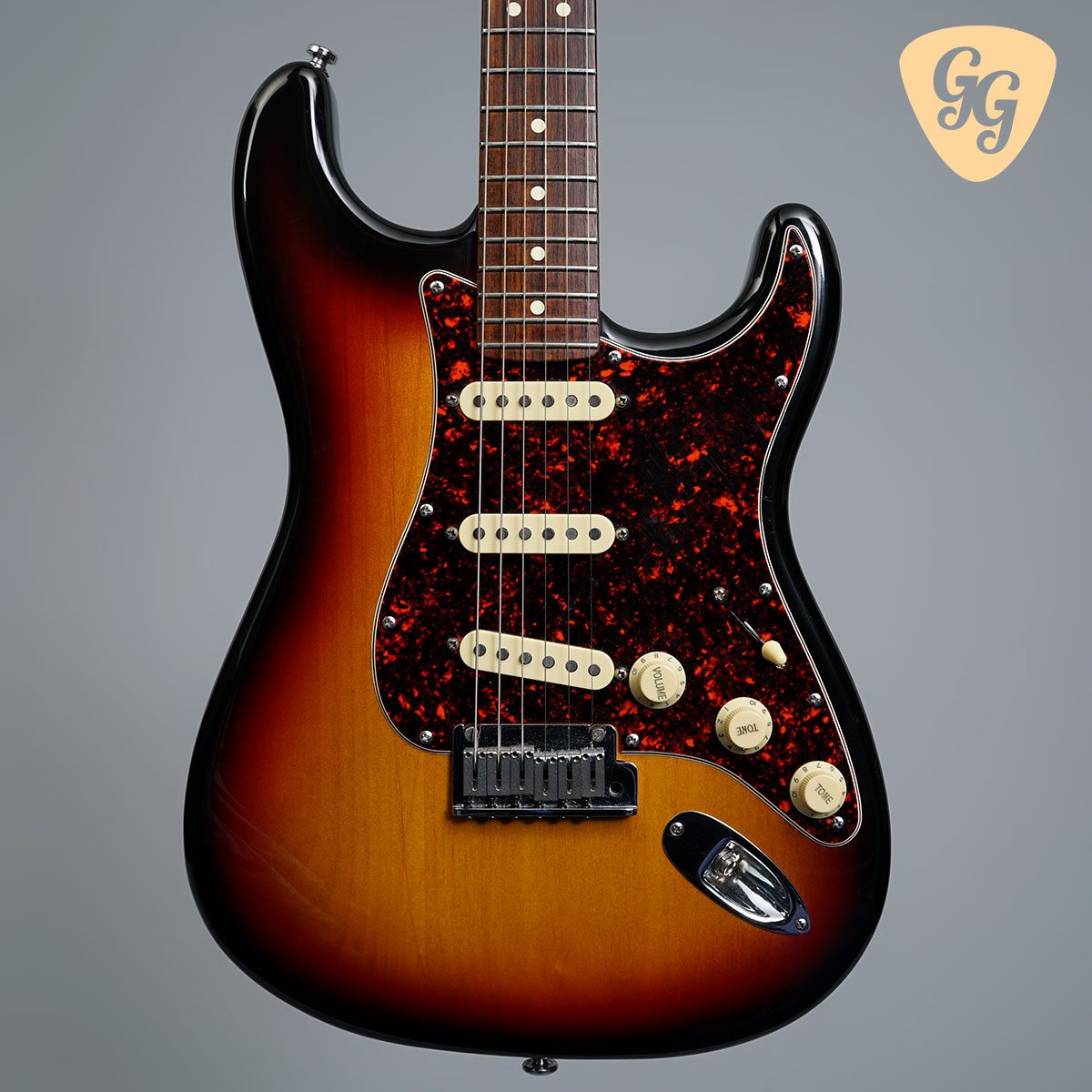 A fantastic look on this 2003 Fender American Standard Stratocaster in three tone sunburst. Set off…