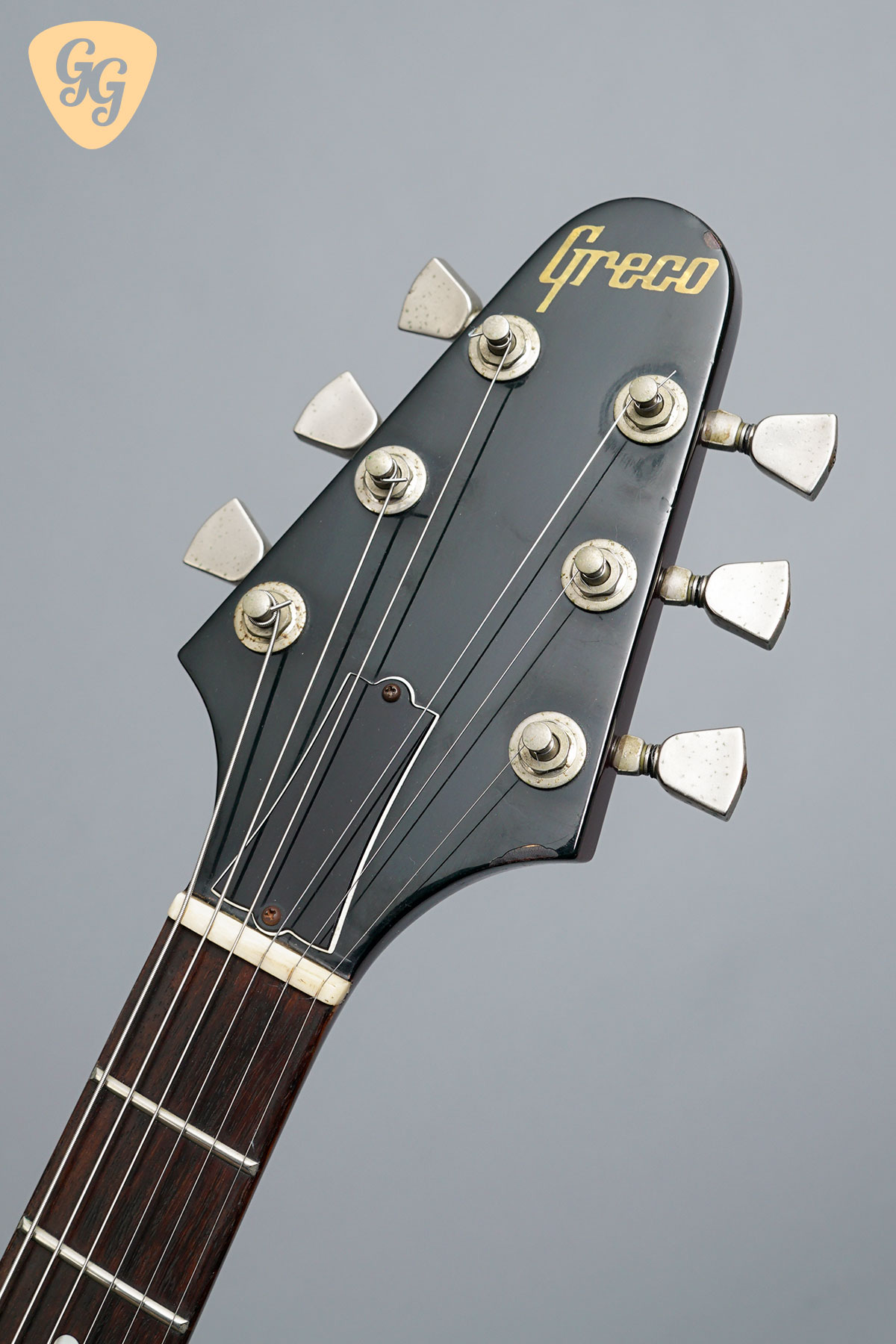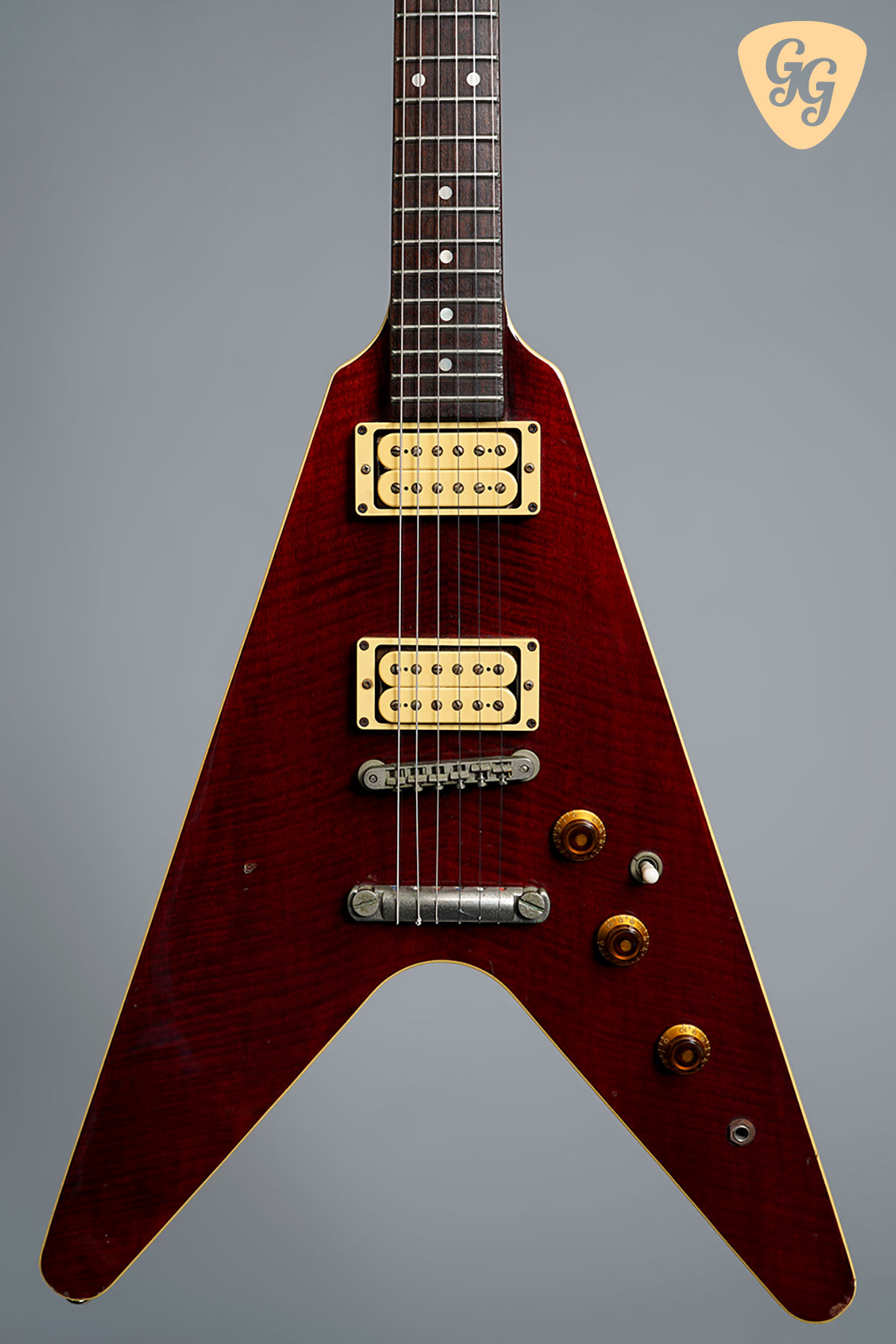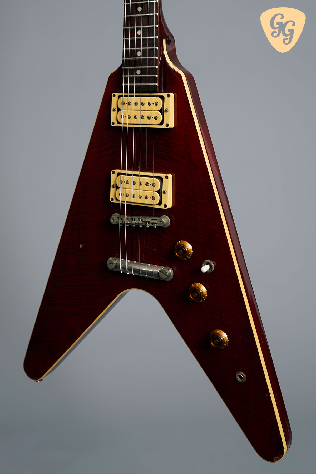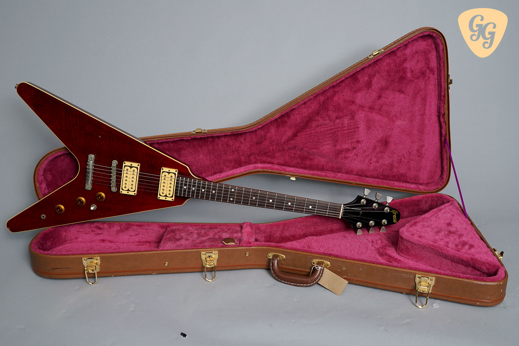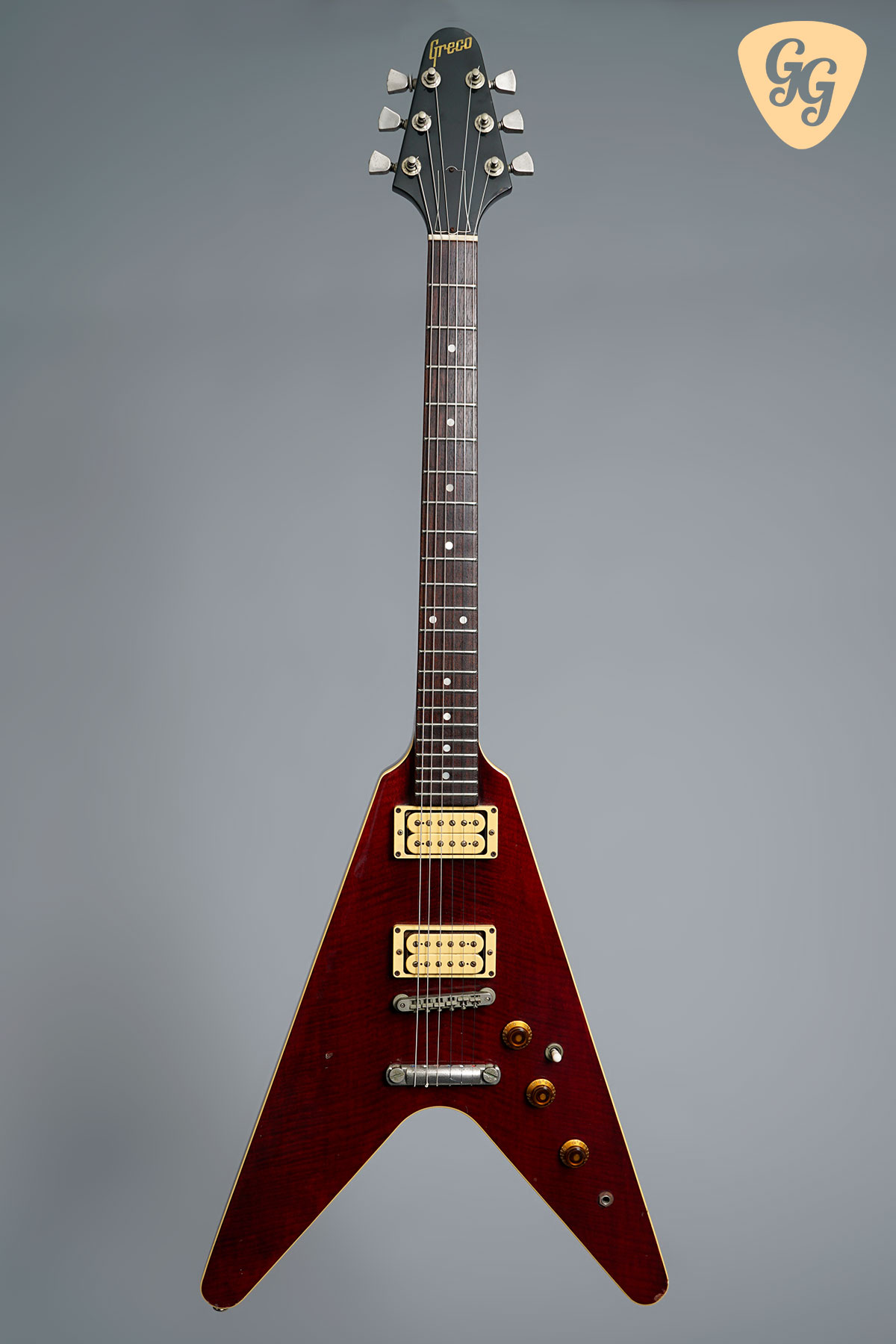 Here we have a fantastic 1981 Greco Flying V style guitar in trans red with a superb flame maple top! In very good overall condition for its age with some marks throughout and a large one as pictured on the lower horn. This guitar is surprisingly lightweight too at only 7lbs/3.2kg! We have given this guitar a full check over, the trussrod and electronics all work perfectly. Included is a fitted hardcase.