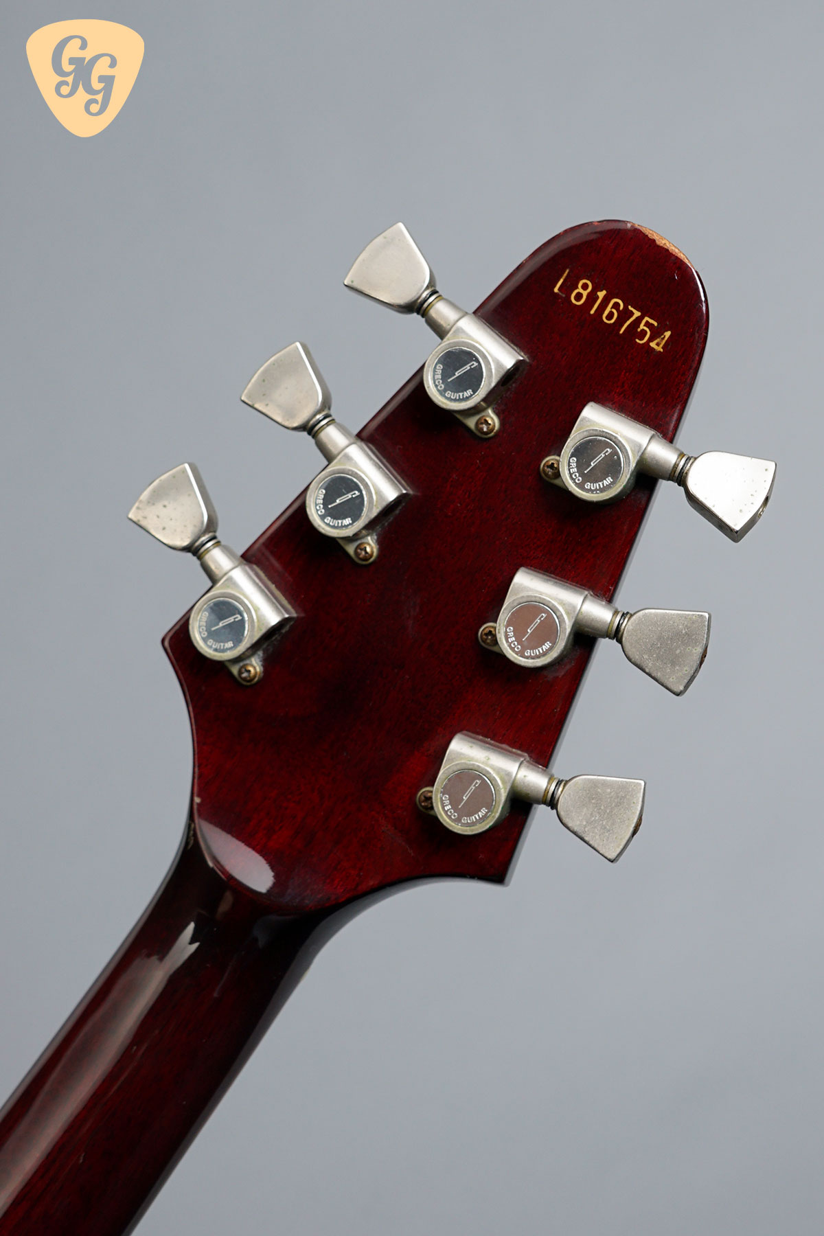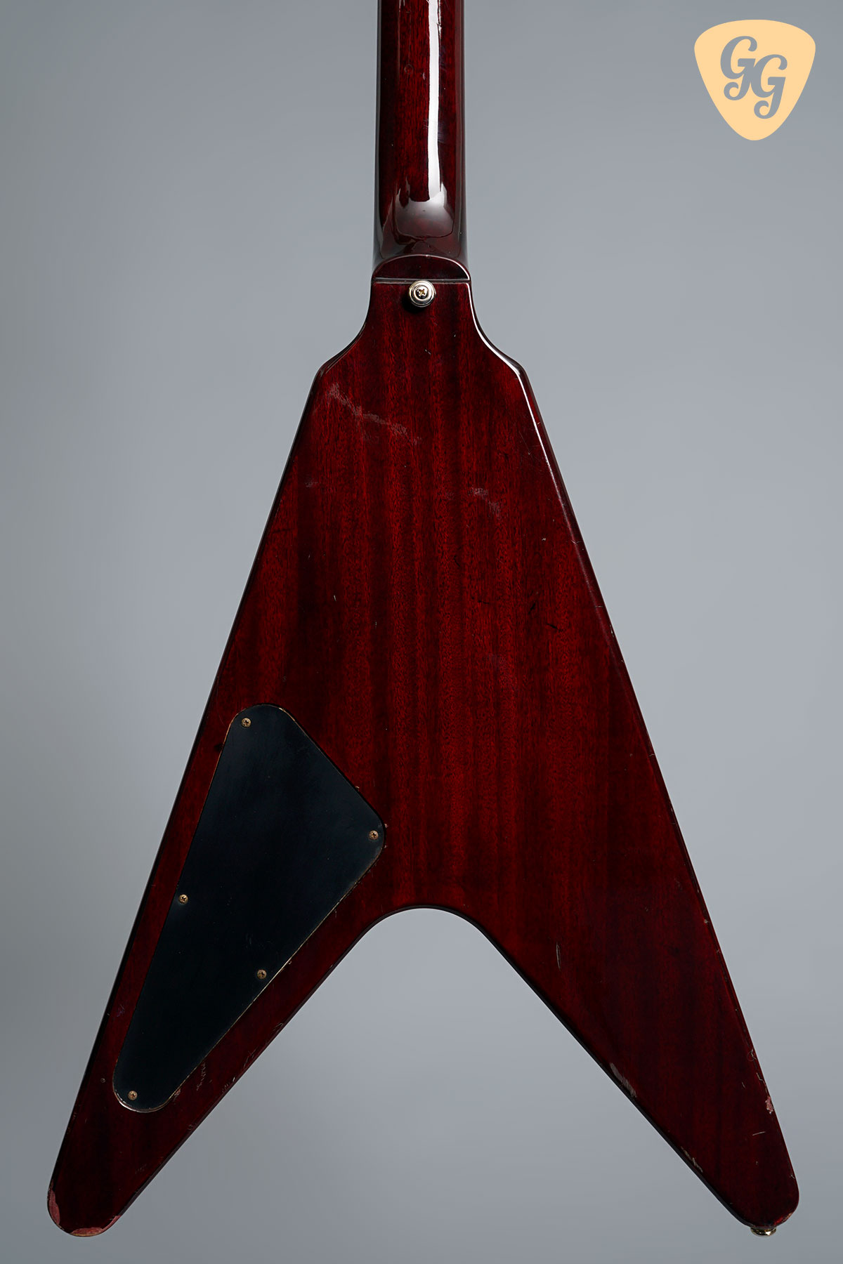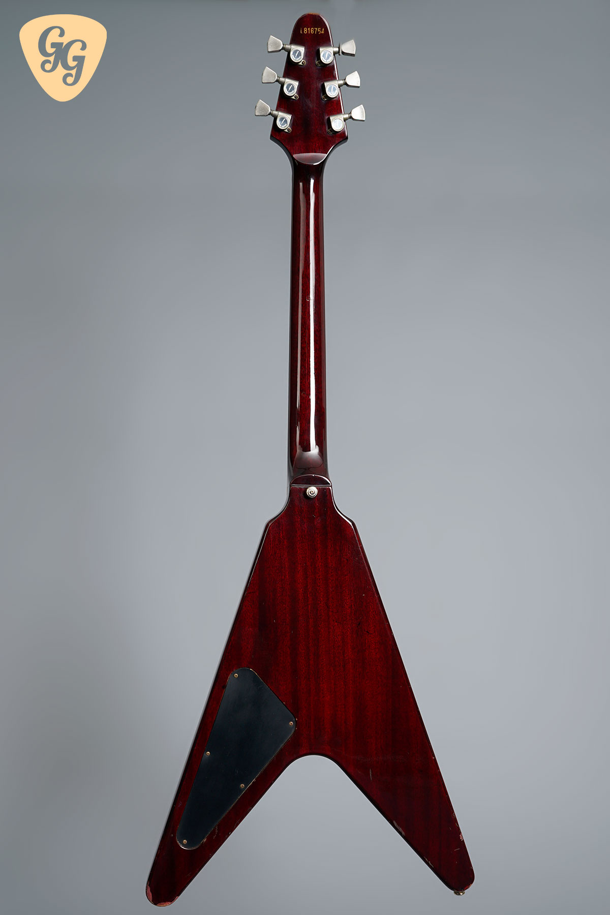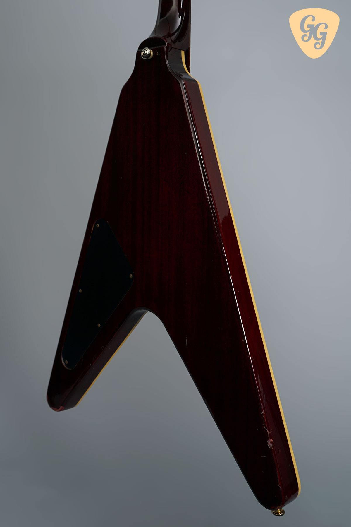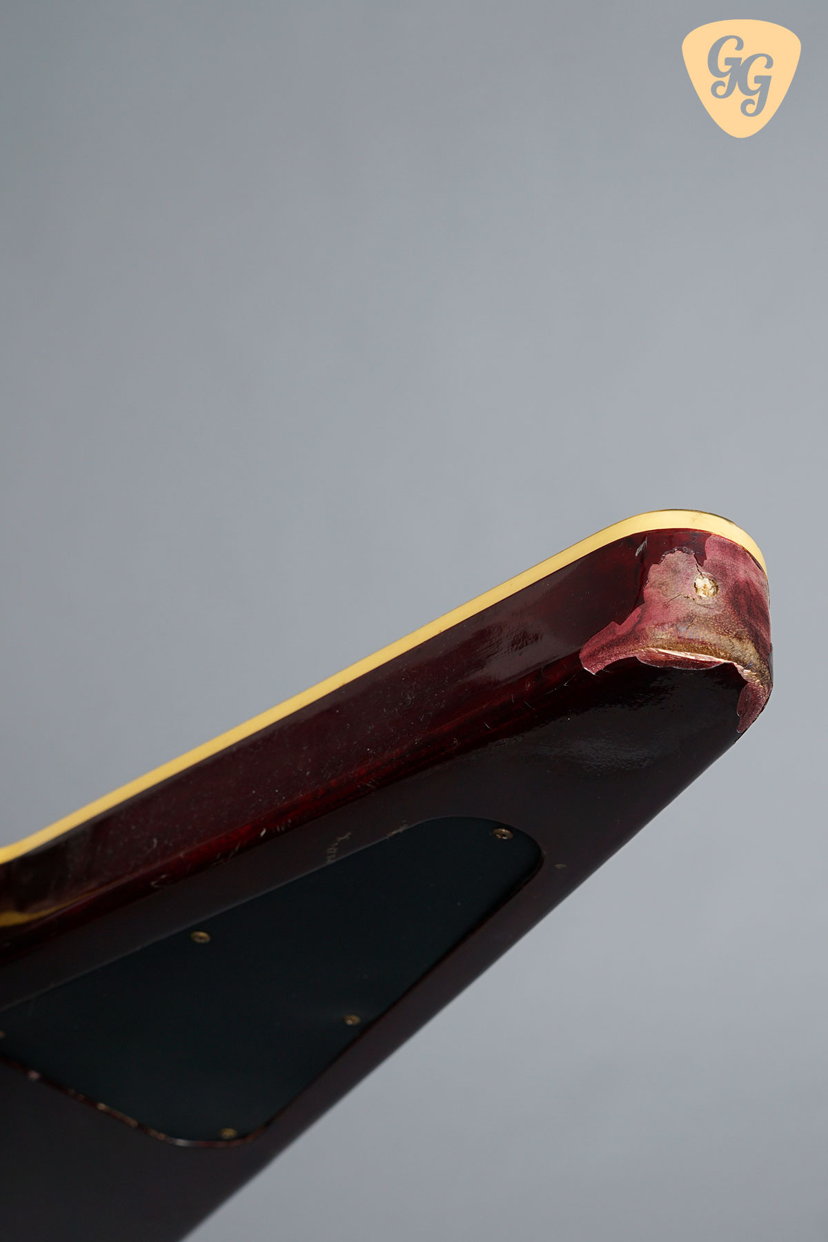 Here we have a fantastic 1981 Greco Flying V style guitar in trans red with a superb flame maple top! In very good overall condition for its age with some marks throughout and a large one as pictured on the lower horn. This guitar is surprisingly lightweight too at only 7lbs/3.2kg! We have given this guitar a full check over, the trussrod and electronics all work perfectly. Included is a fitted hardcase.
