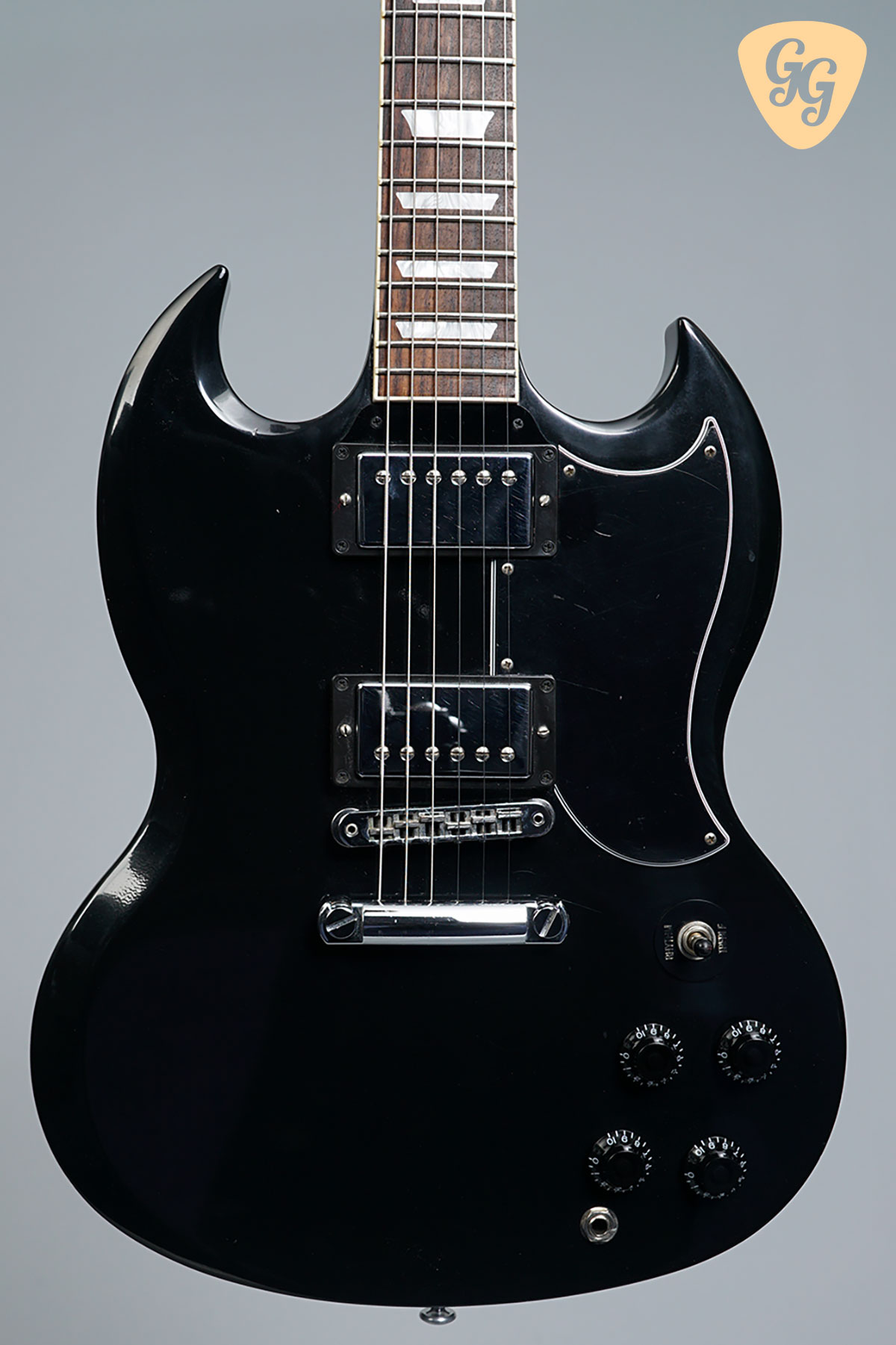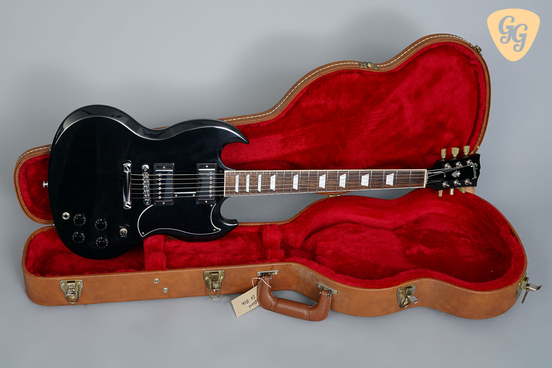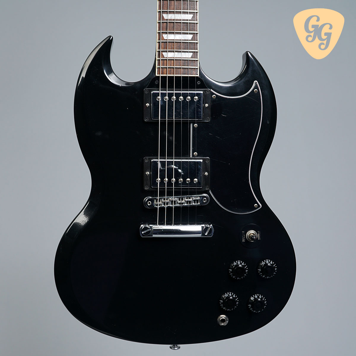 Here we have a fantastic Gibson SG Standard in Ebony, this one really has that classic SG look! The guitar is in good condition, with lots of signs of use throughout body, including small dings back of neck at second fret. The finish is going matte and clouding up all over. We have given this guitar a full check over, the trussrod and electronics all work perfectly. Included is a hardcase.