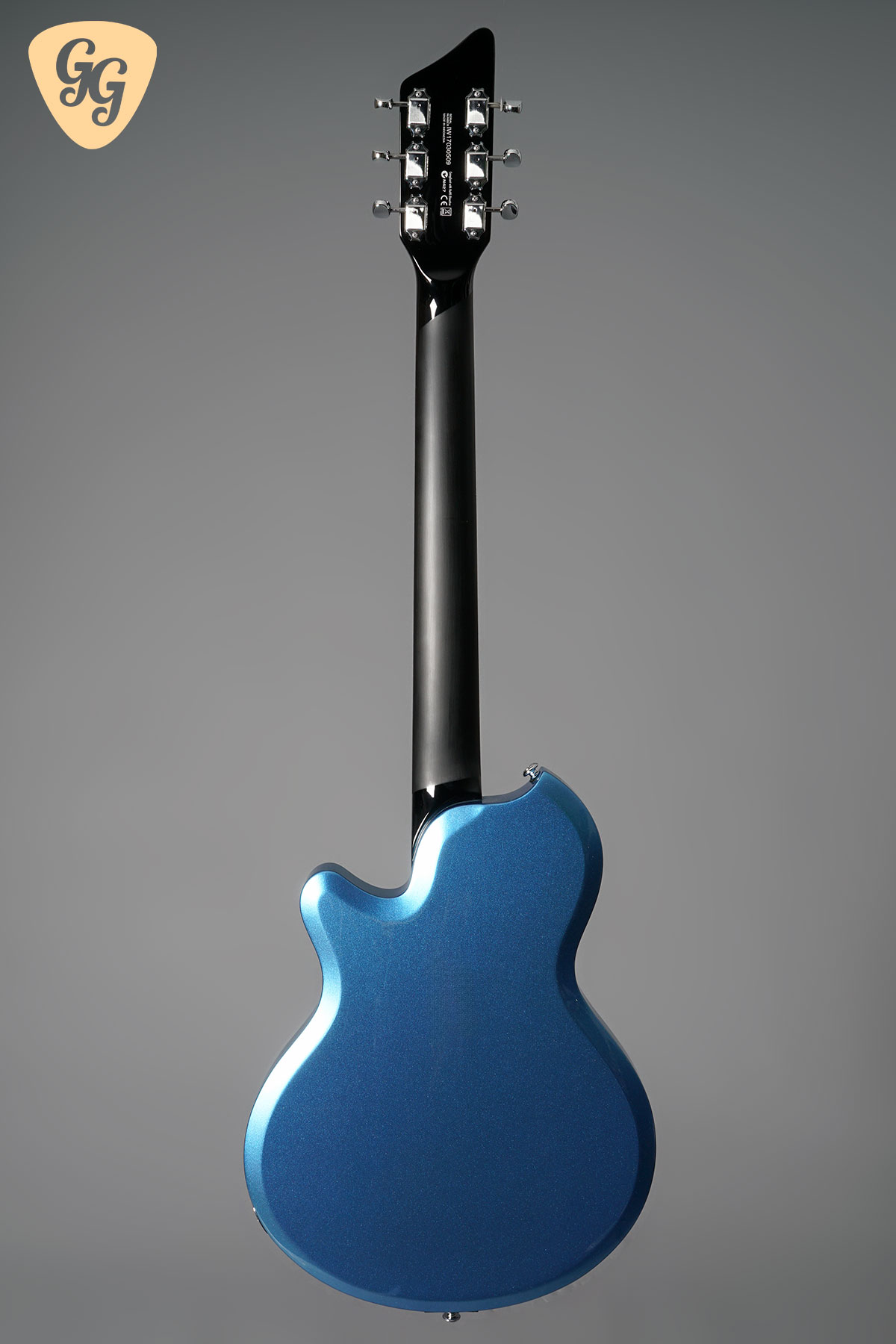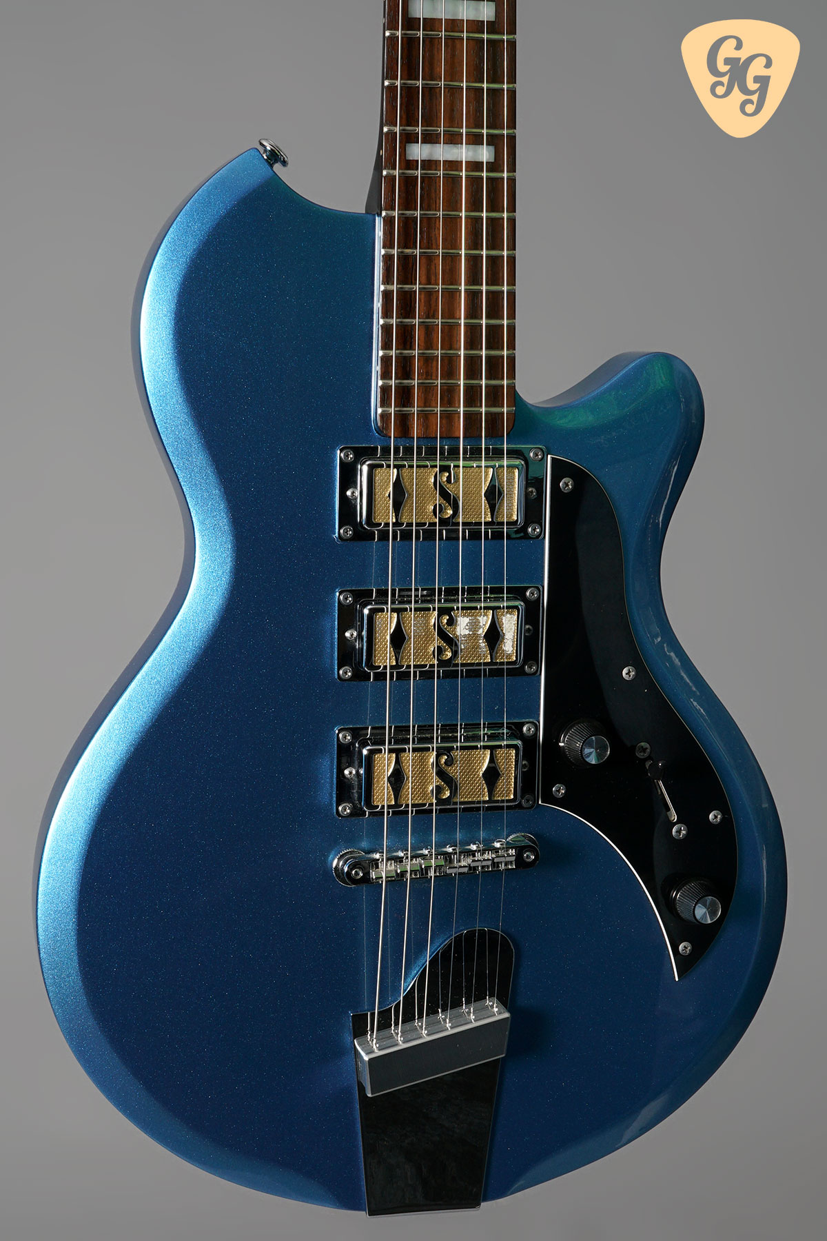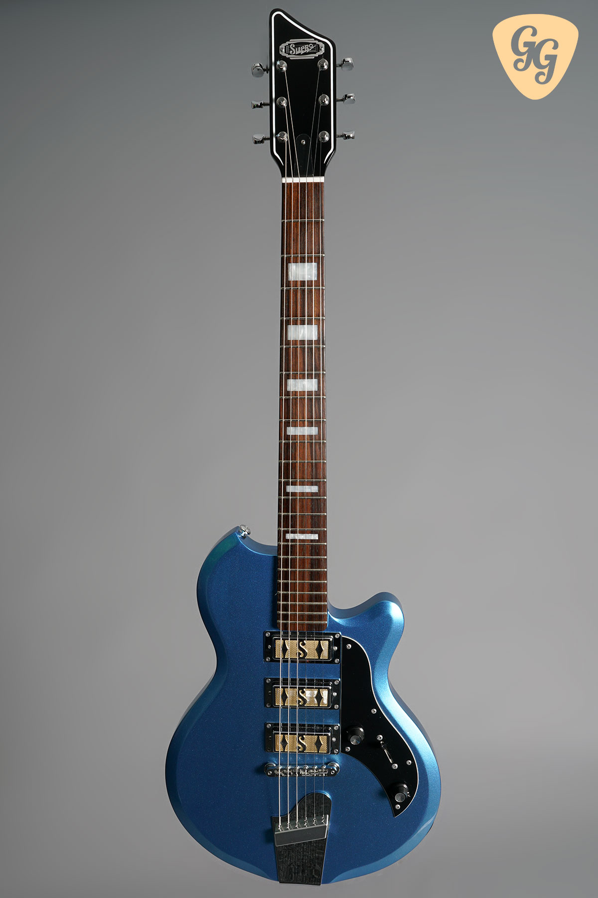 Supro 2030BM Hampton Island Series Guitar – Ocean Blue Metallic The Hampton is a 21st-century update of the Supro electric solid-body guitar. The elegant comfort of the 1960 s-era beveled-edge Ozark body shape and the mighty sound of the original field-coil pickups have been enhanced with an ultra-fast satin neck, Tune-o-matic bridge and updated wave tailpiece. The result is a modern players instrument with old-school style and authentic Supro tone. This guitar is in excellent condition with very little signs of wear. Included is a gig bag.