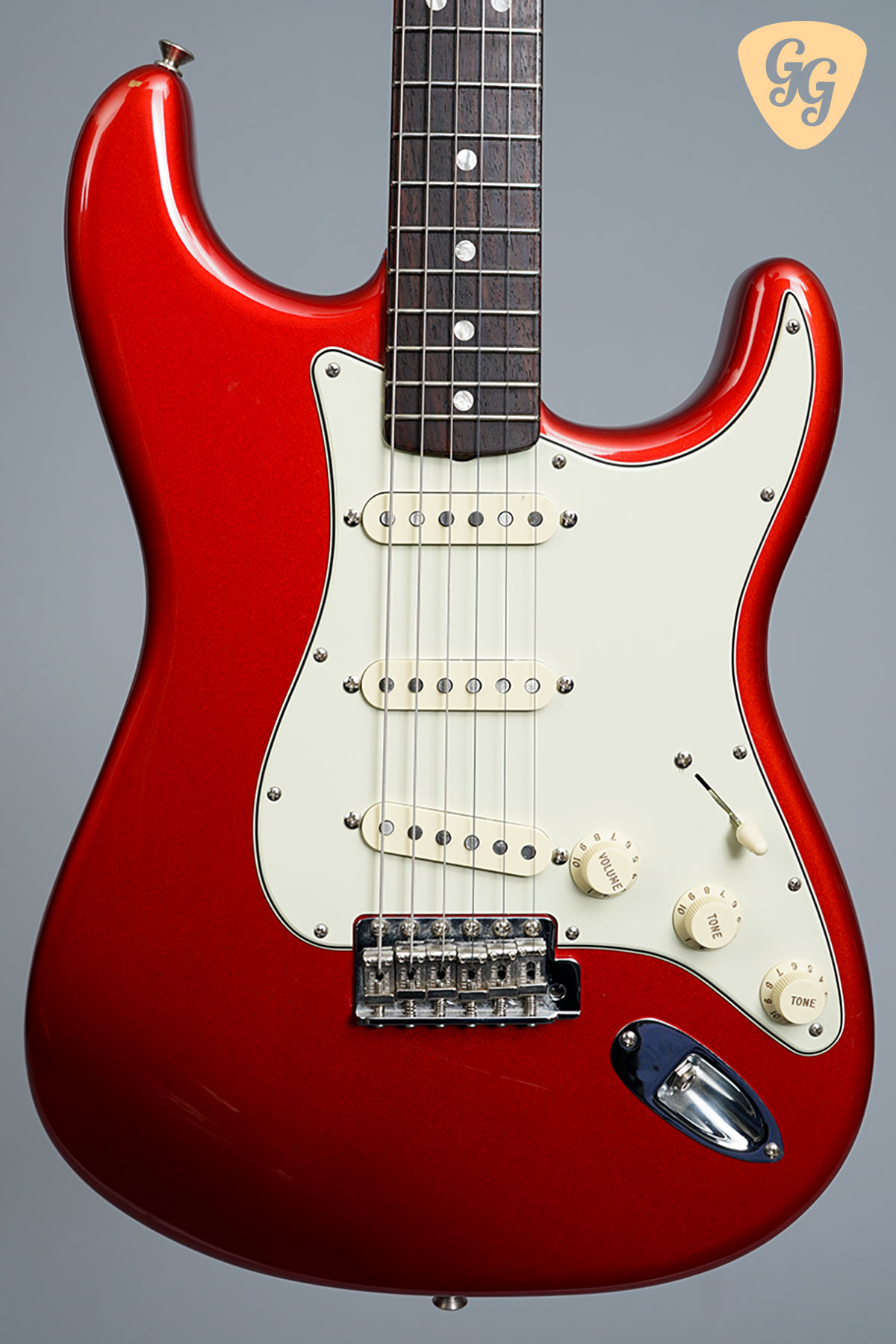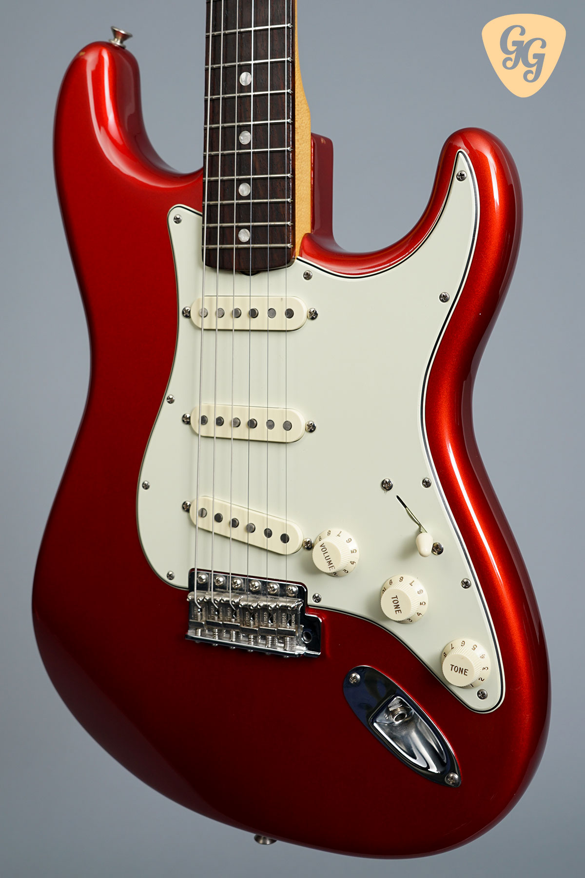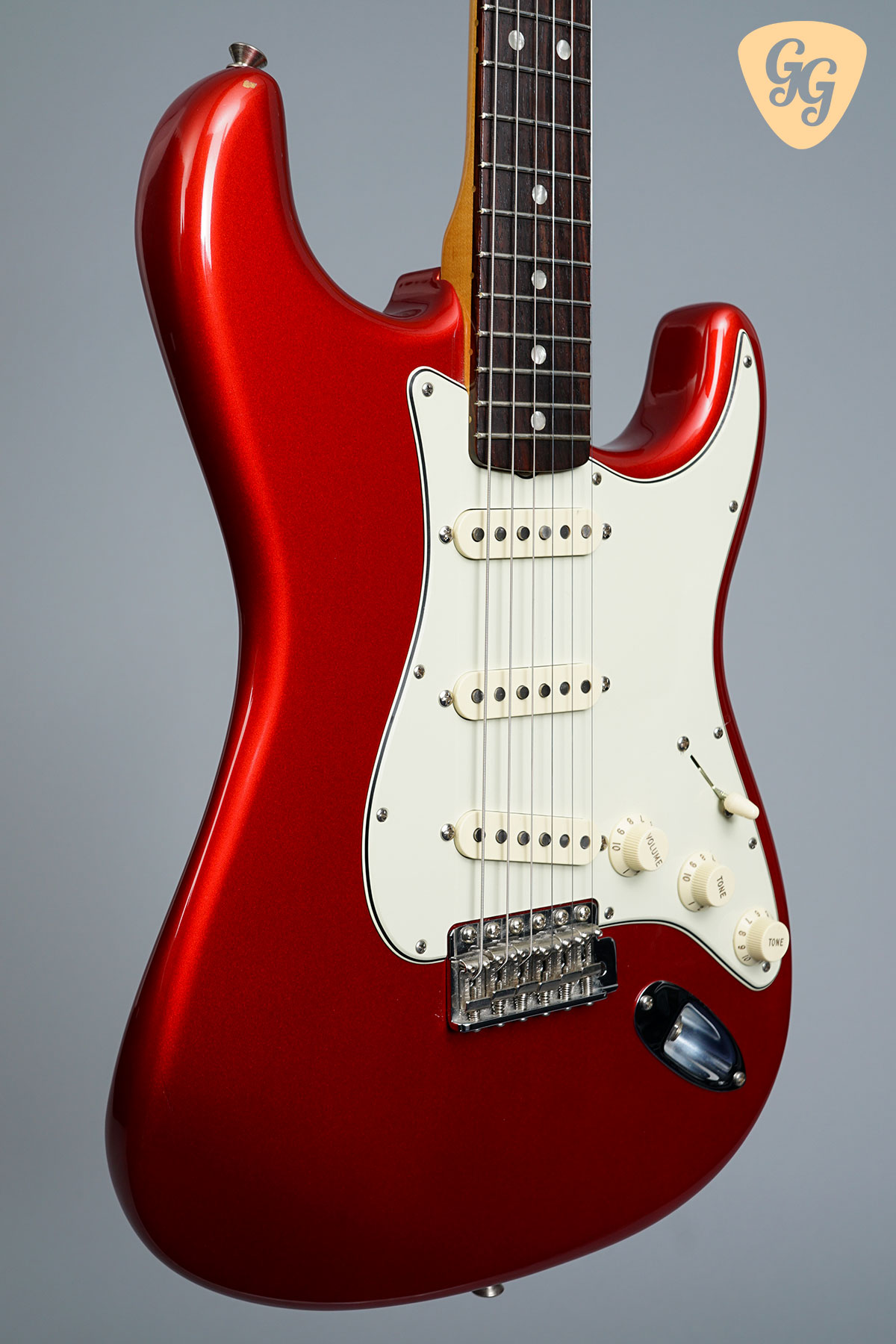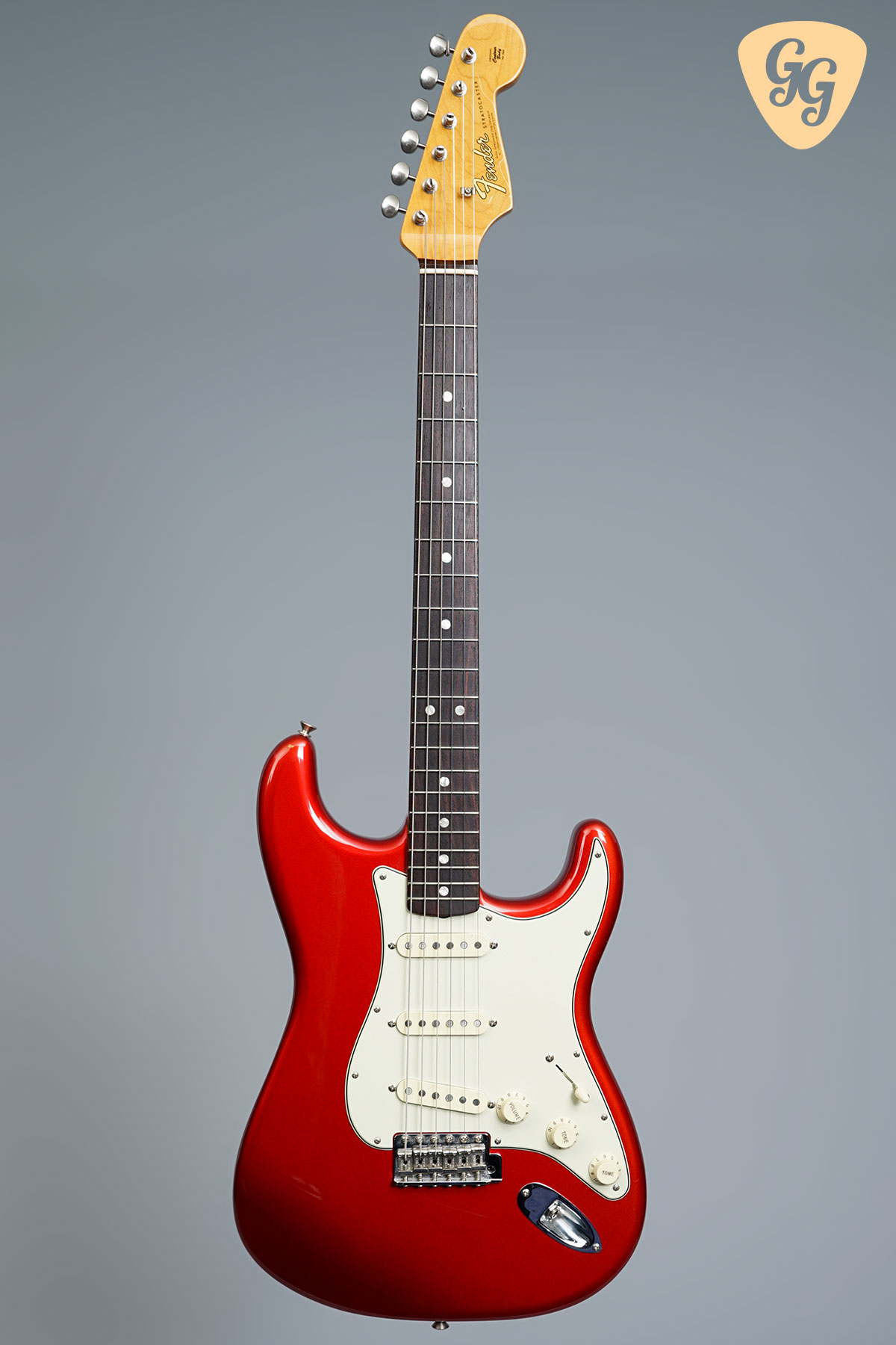 Here we have a Fender American Original ’60s Stratocaster in cool Candy Apple Red. This guitar is in excellent condition overall, but there is a small ding on the side of the body. This is a real beauty! Included is the original hardcase and all of the case candy.